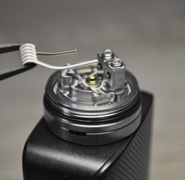 Сначала попробуем запустить атом на тех спиралях, что имеются в комплекте. Для этого нам понадобится снять колечко, затем выкрутить пару винтов на стойках. И сталкиваемся с первой трудностью – ставить койлы теперь не так удобно, так как мешается ограничитель испарительной камеры, из-за чего приходится ножки заранее подгибать.