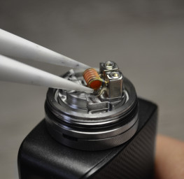 Ставим вату, тут этот процесс малость специфичный. Сначала ее потребуется завести внутрь спирали, а после этого концы поднять вверх, словно кроличьи ушки, и надеть сверху кольцо. В качестве ватки используем знаменитый «Бекон», но можно и любую другую, проблем с жижеподачей тут быть не должно.